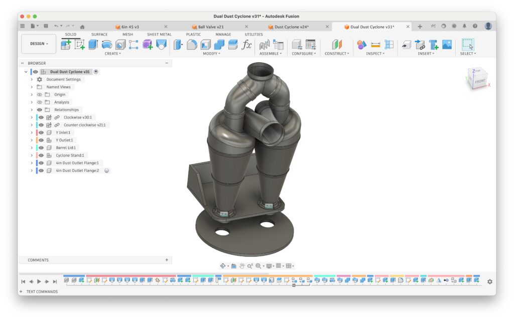 I didn’t feel like it would be effective for my shop, and I have more vertical space than I do horizontal space, so I decided that going “up” with a “traditional” vertical cyclone separator was a better solution. However, printing a single cyclone wouldn’t be possible; it would have to be way larger than what I could print, and breaking it up into multiple pieces would be difficult to print and glue together. So, I opted for a dual cyclone separator design.